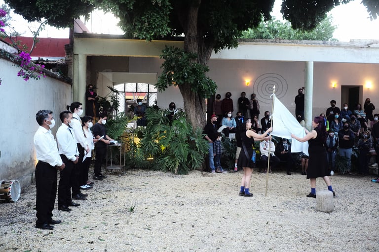 Con su performance colaborativo “Lengua Materna", Paola y su madre, Rebeca, se apropian de gestos, diálogos y acciones patrias, para rechazar el lenguaje dominante nacional que se apodera de la relación madre-hija. De esta manera, el lenguaje entre ella y su madre es limitado y superado por el hecho de estar constantemente tejiendo los términos de su relación. La textura de este tejido, de esta conversación, disuelve la jerarquía entre madre e hija y con ello sacude la idea tradicional de la familia para proponer una noción distinta de “lengua materna” que poco tiene que ver con el apellido y el idioma oficial del estado, sino con una lengua compartida que surge entre dos personas que se permiten entrelazarse.